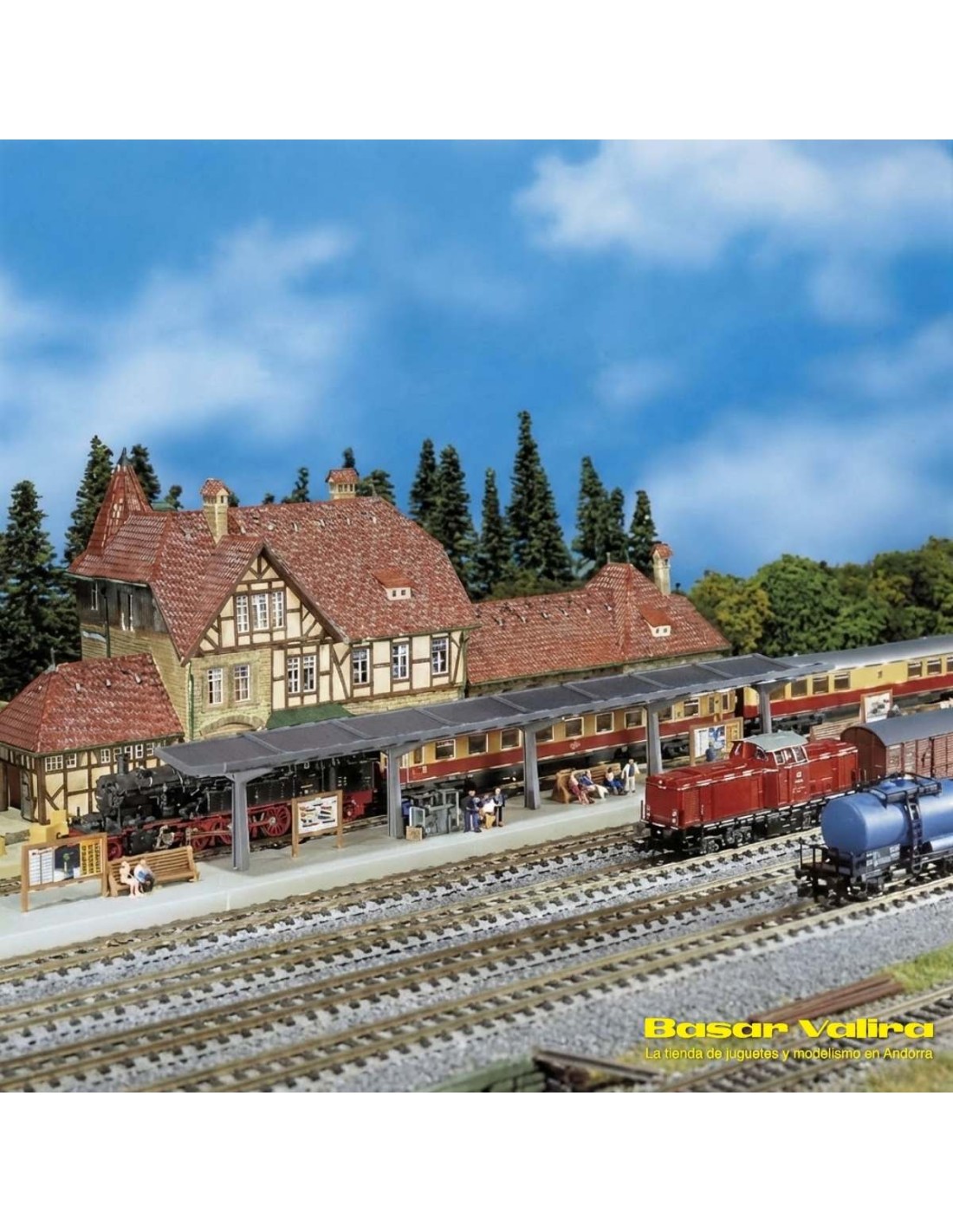 Ce quai couvert de Faller pour la Époque II améliore le réalisme et la fonctionnalité des gares. Il protège les passagers et accentue le cadre ferroviaire.